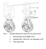 The intended use of the snatch block is deflection of the wire rope or doubling of the pulling force at pulling winch operation, i.e. during recovery and moving of ground adhesive loads up to an inclination of 45°.